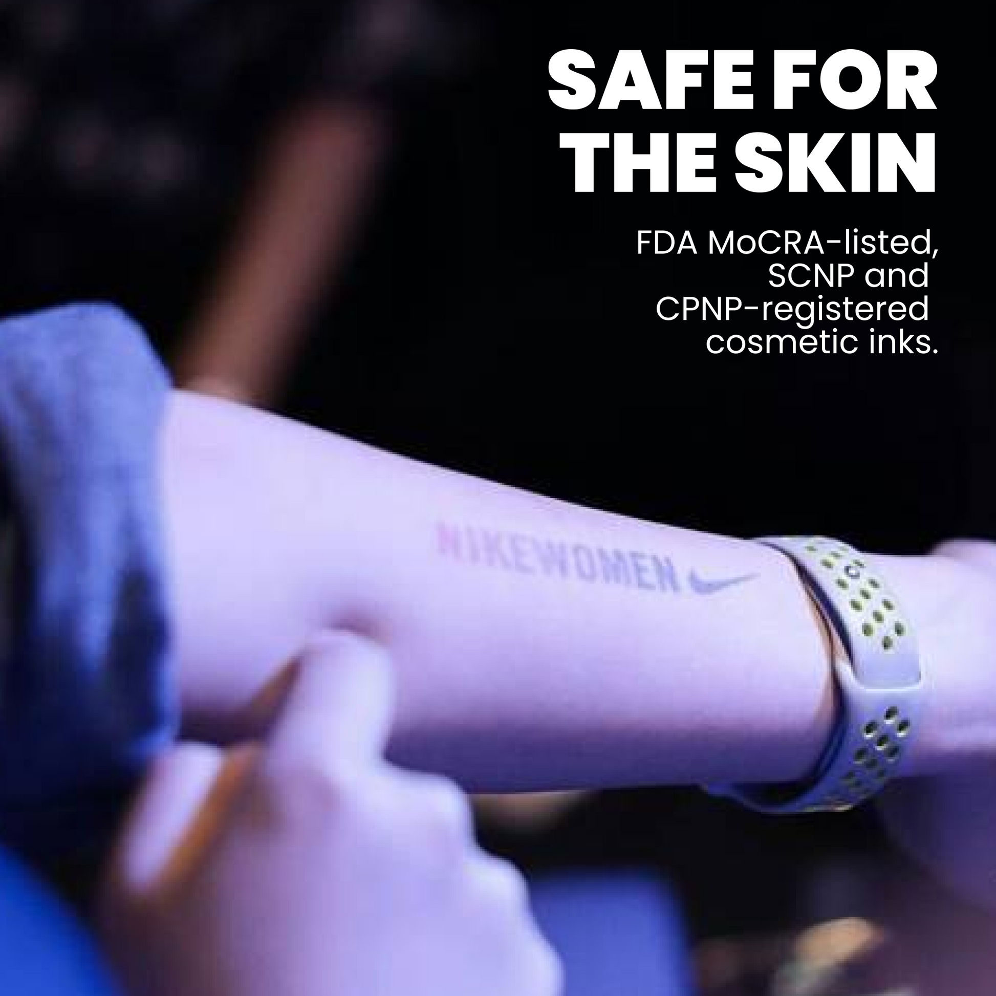 Prinker S is designed for those who want larger, bolder, and more defined temporary tattoos. With a wider print height, it delivers sharper, more professional-looking designs. Perfect for skin applications, the Prinker S uses cosmetic-grade, FDA-MoCRA listed, CPNP and SCNP-registered inks that are water-resistant yet easily washable with soap. Whether you're expressing creativity or branding an event, the Prinker S offers high-quality, long-lasting prints in both black and vibrant colors.