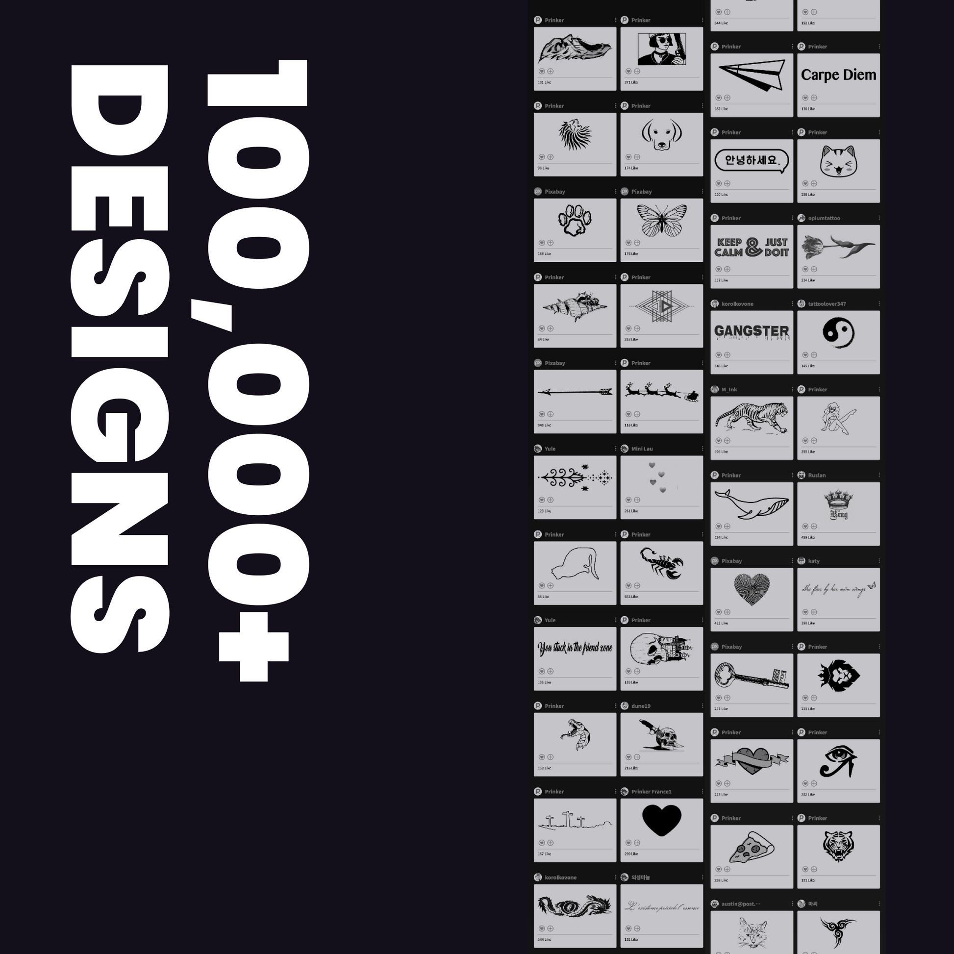 Choose from100,000+of pre-designed tattoos or upload your owncustom artusing the easy-to-use app.
